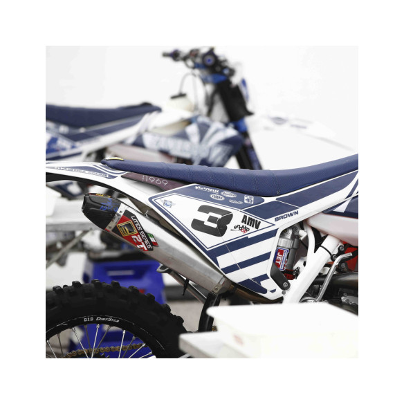 El revestimiento exterior en níquel + cromo que garantiza una gran resistencia a la intemperie. El desarrollo está optimizado para reducir el volumen y mantener la bufanda muy cerca del motor. Para la versión enduro la bufanda suaviza la salida del motor sin penalizar la potencia máxima. Compatible con el silenciador original.