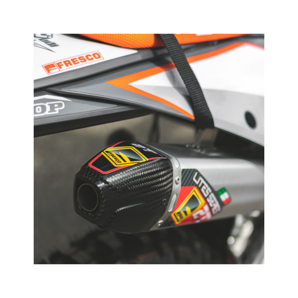 El revestimiento exterior en níquel + cromo que garantiza una gran resistencia a la intemperie. El desarrollo está optimizado para reducir el volumen y mantener la bufanda muy cerca del motor. Para la versión enduro la bufanda suaviza la salida del motor sin penalizar la potencia máxima. Compatible con el silenciador original.