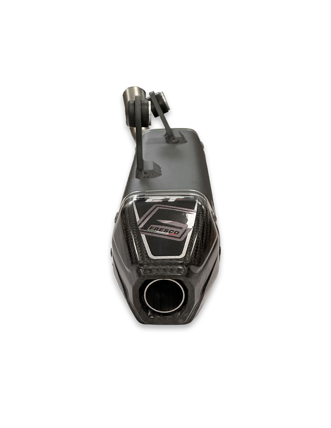El silenciador Fresco Carby combina la ligereza del aluminio, la robustez del acero inoxidable y la flexibilidad de la fibra de carbono.