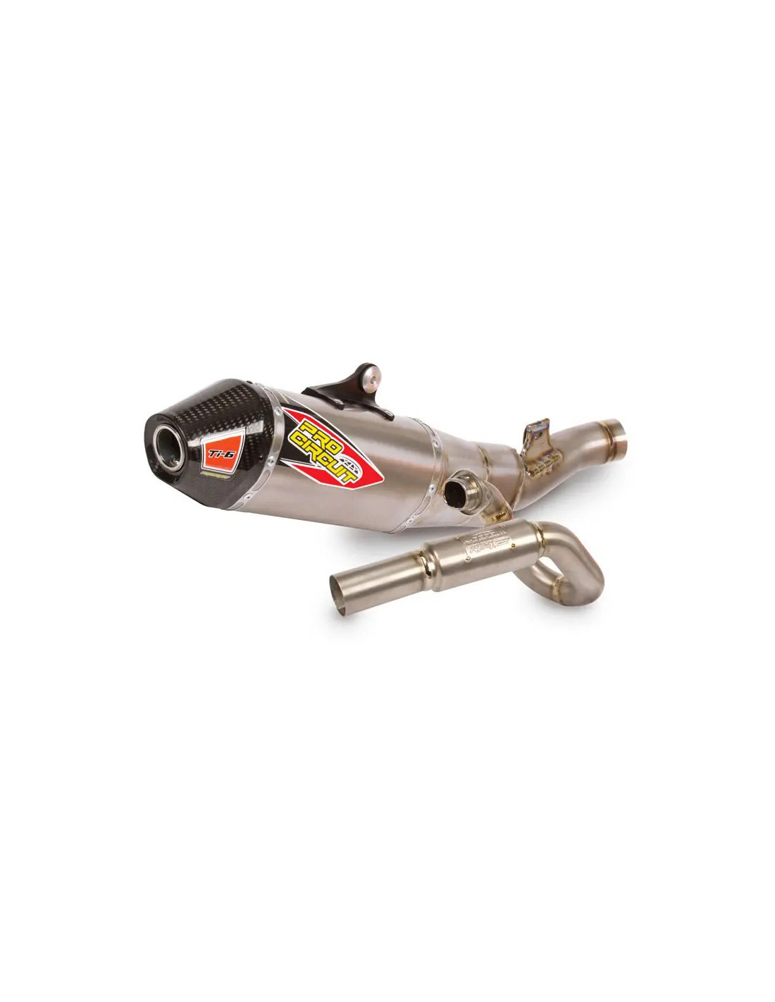 El sistema de escape de titanio Pro Circuit Ti-6 está diseñado para mejorar el rendimiento y está fabricado en titanio en su totalidad junto con una tapa en fibra de carbono para el extremo del silenciador. El Ti-6 es ideal para cualquier piloto de carreras en circuito cerrado o todoterreno que busque un mayor rendimiento, durabilidad y una apariencia profesional. Si bien el Ti-6 no cumple con los requisitos de sonido de la FIM que se utilizan en las carreras profesionales en Estados Unidos o Europa, sí cumple con los requisitos de ruido para aficionados de la AMA y viene equipado con un parachispas extraíble aprobado por el USFS, lo que facilita a los pilotos alternar entre carreras todoterreno y en circuito cerrado.