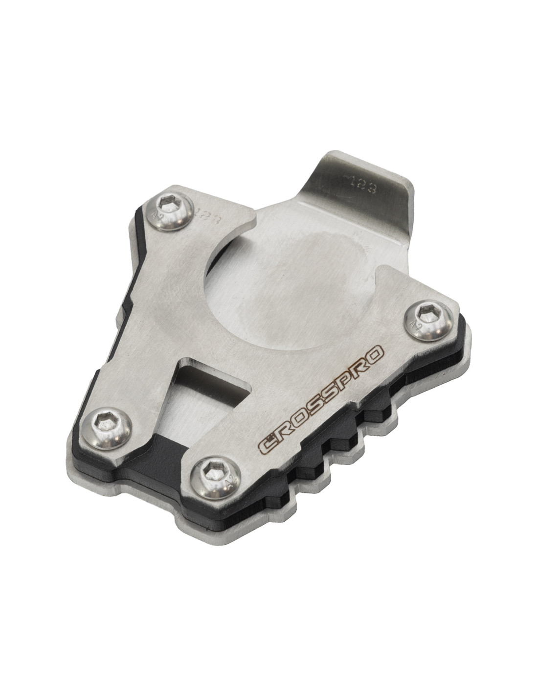La base de ampliación para el caballete lateral de Crosspro aumenta la zona de apoyo y aporta más estabilidad en terrenos difíciles como arena, tierra o grava.
