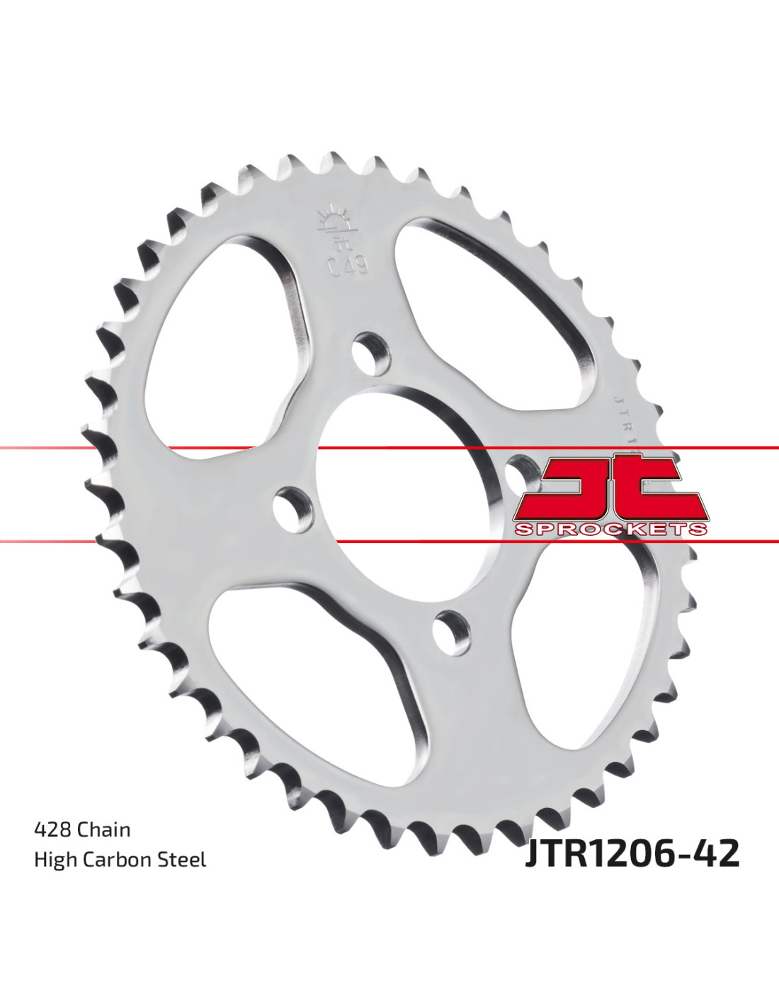 Los piñones y coronas de acero JT se fabrican utilizando acero de alto carbono C49 de la mejor calidad para las coronas y aleación de acero cromado SCM420 para los piñones. La gama de piñones y coronas JT cuenta con más de 2500 modelos para todas las motocicletas y vehículos todo terreno.