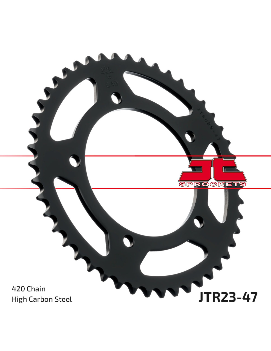 Los piñones y coronas de acero JT se fabrican utilizando acero de alto carbono C49 de la mejor calidad para las coronas y aleación de acero cromado SCM420 para los piñones. La gama de piñones y coronas JT cuenta con más de 2500 modelos para todas las motocicletas y vehículos todo terreno.