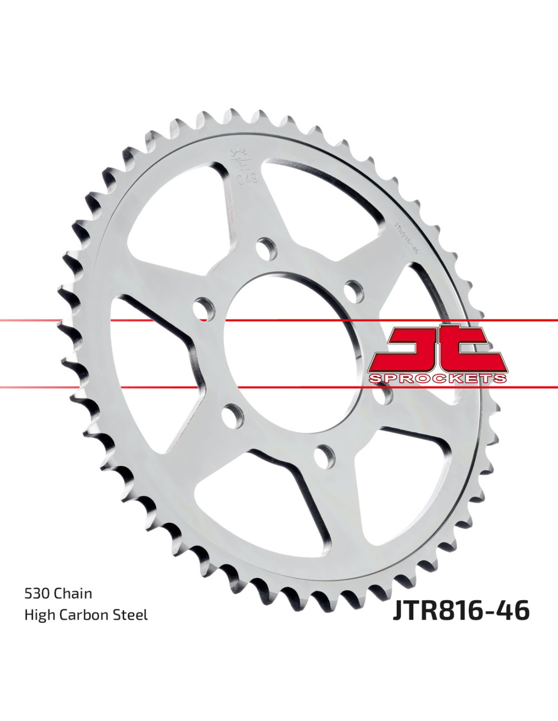 Los piñones y coronas de acero JT se fabrican utilizando acero de alto carbono C49 de la mejor calidad para las coronas y aleación de acero cromado SCM420 para los piñones. La gama de piñones y coronas JT cuenta con más de 2500 modelos para todas las motocicletas y vehículos todo terreno.